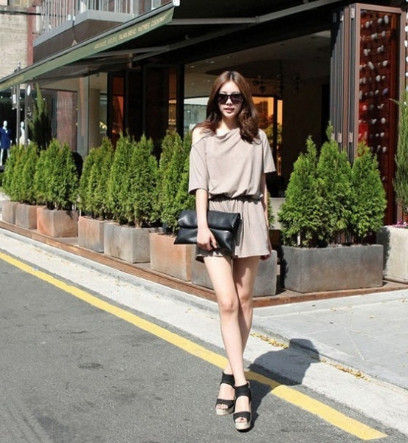 道晖芝同样不逊色,斜肩连体裤,纯色系,简单干净,符合大牌范~!搭配一双高跟鞋,黑色包包呼应,气场十足!