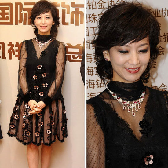 2012年9月18日,上海,赵雅芝出席首饰展开幕式。她身穿坠有花朵装饰的黑色纱裙尽显风姿绰约,脖子和手上戴着珠宝首饰。虽然眼角显皱纹露老态,但现场近百人围观,“不老玉女”人气不减。