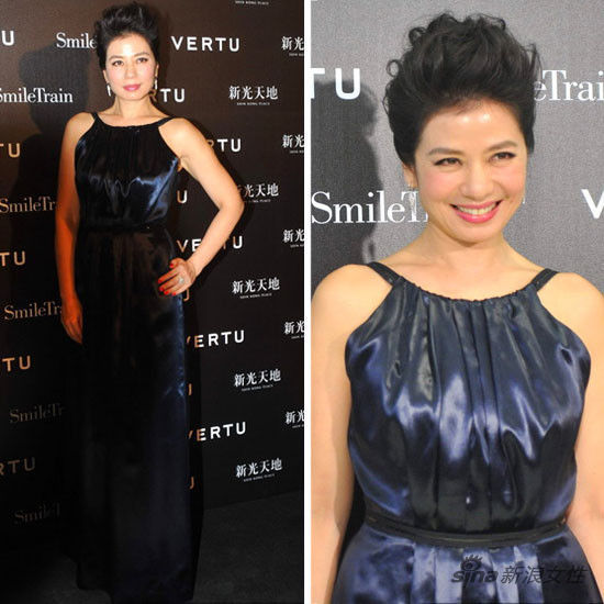 2012年8月17日,北京,Vertu SmileTrain微笑系列图片展开展仪式。钟楚红身穿蓝色亮片blingbling挂脖长裙,盘起头发来很精神,笑容也很灿烂。