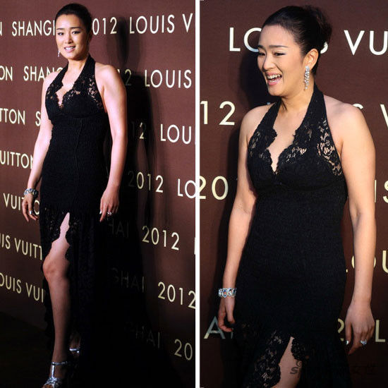 2012年7月18日,上海,恒隆广场路易-威登之家(LouisVuitton)开幕酒会。 巩俐一身黑色蕾丝高开叉长裙登场,大秀性感美腿。