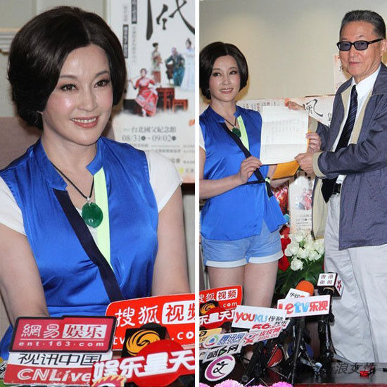 2012年8月28日,台北,刘晓庆宣传舞台剧《风华绝代》,好友李敖捧场助阵。刘晓庆一身蓝白搭配,妆容也很干净,精神气儿十足!