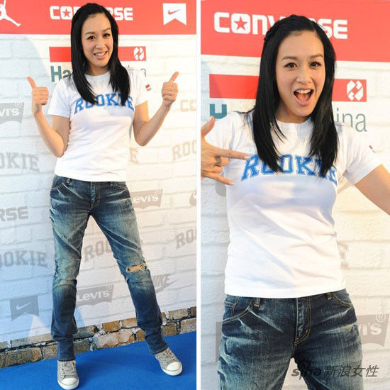 2012年9月12日,香港,陈慧琳出席“邀月童聚迎中秋”活动。白色T恤搭配蓝色牛仔裤+大红色的休闲鞋,青春气息十足,一点儿也不像40岁的女人哦!