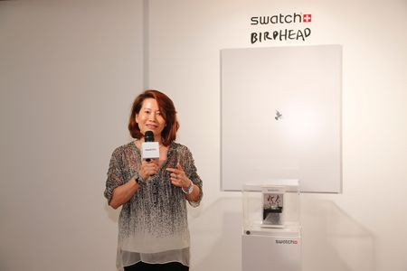 斯沃琪集团中国区总裁暨斯沃琪和平饭店艺术中心总经理陈素贞女士与艺术家鸟头组合合影展示斯沃琪水墨大鸟腕表鸟头组合对于创作灵感的解释: