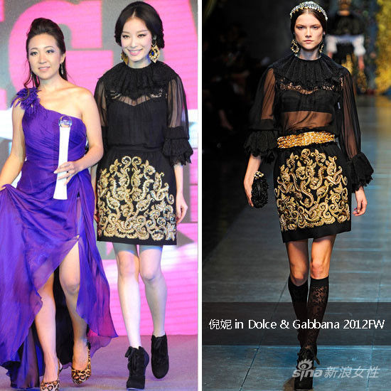 倪妮身穿Dolce & Gabbana连衣裙,上半身是蕾丝透视衫,搭配刺绣铅笔裙,大珍珠耳环雍容华贵。和模特不同的是,倪妮在这身造型上做了减法,去掉了银色的发饰、金黄色的腰带,腿上也没有穿丝袜,轻凉初秋大方露出美腿。