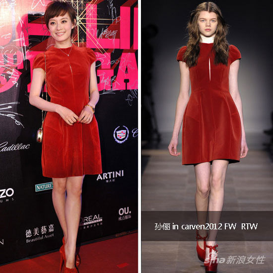 孙俪身着carven2012秋冬系列大红色天鹅绒连身短裙,中间微小的开胸设计有点小性感,搭配酒红色短发和红色高跟鞋风格统一,手腕上的金色配饰起到了点睛作用。