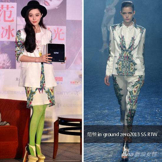 范爷身着ground zero2013春夏系列的印花白色裙装,仍然搭配stephanerolland2012秋季高定系列花盆底鞋亮相庆功发布会。看来范爷是有多爱这双鞋呀!