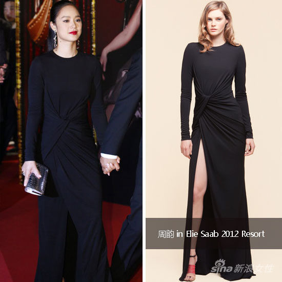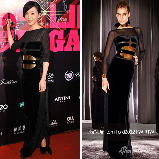 张静初身着tom ford2012秋冬系列黑色长裙亮相。天鹅绒奢华魅惑,上半身的薄纱透视设计让bra若隐若现,硕大的金色腰扣很突兀,与模特相比,配饰着实少了一些。