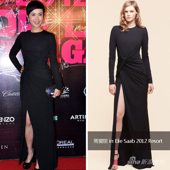 蒋雯丽黑色长裙低调大气,ElieSaab 2012 早春黑色高开叉长裙。她搭配了银质长耳坠、银色手包和黑色高跟鞋,相对保守。
