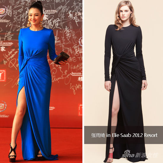 姜文、顾长卫、王全安都是中国知名导演,他们各自的夫人周韵、蒋雯丽、张雨绮个个都是大美女,可见导演挑老婆也和挑演员一样,眼光独到。蒋雯丽69年生人,周韵78年生人,张雨绮86年生人,这三位著名导演夫人,60后、70后、80后的顶级美女集体撞衫,都身着Elie Saab2012早春系列的一款长袖圆领连身裙。