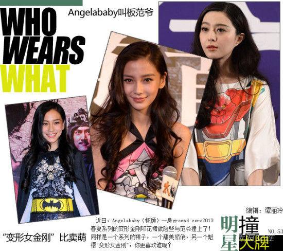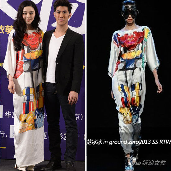 导语:撞衫,是每个人都不愿发生的事,最尴尬的,是同一件衣服穿在别人身上比在自己身上更好看!即使是范爷,也不能逃过这份尴尬。近日,Angelababy(杨颖)一身ground zero2013春夏系列的变形金刚印花小短裙就险些与范爷撞上了!同样是一个系列的裙子,两个人演绎有何区别呢?
