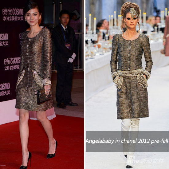 Angelababy(杨颖)一身小贵妇造型亮相cosmo美容大奖,裙子来自chanel2012先秋印度系列,珍珠装饰是亮点。但是长相甜美娇嫩的baby不太适合这个颜色,有点老气了。