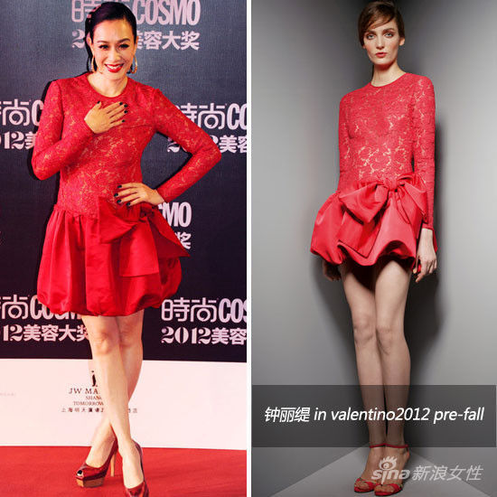 钟丽缇[微博]与宋佳撞衫了,辣妈朱唇诱人四射,这丰满的身材穿上这条Valentio裙子有点“爆炸”,过分“性感”了。