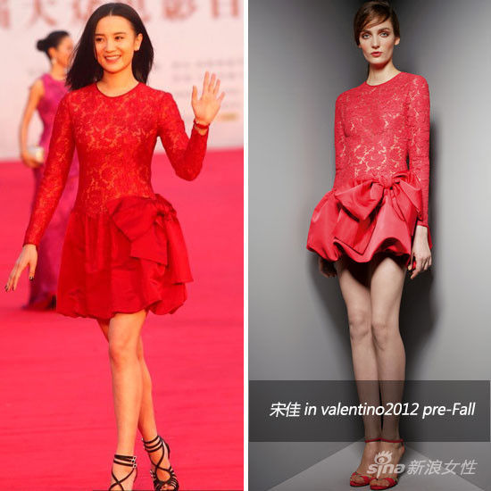 2012年9月29日,浙江绍兴,第21届金鸡百花电影节闭幕红毯。小宋佳身穿Valentio 大红色蕾丝连衣裙,清新的发型和妆容很适合这条喜庆俊俏的裙子。