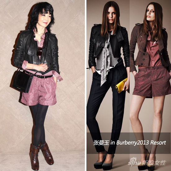 2012年11月1日,香港,Burberry[微博]新店开幕礼。张曼玉身穿Burberry2013春夏新款服装出现,枚红短裙搭配黑色机车皮夹克,帅性十足!