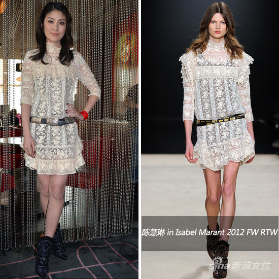 陈慧琳身穿Isabel Marant2012秋冬系列白色蕾丝透视裙现身,造型基copy修长模特,连腰带鞋子都是一样一样的。
