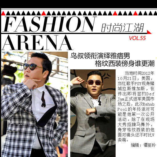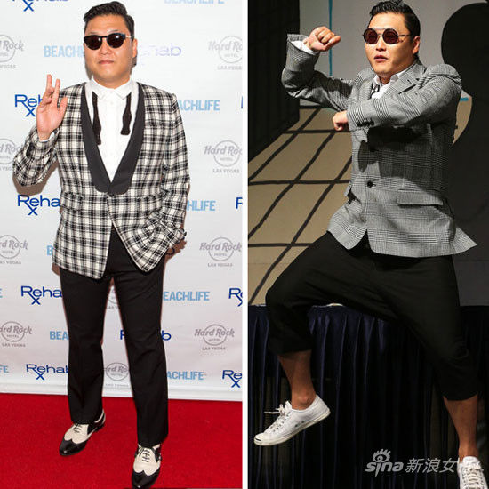 左图:当地时间2012年10月21日,美国,当红歌手PSY黑白格纹西装现身赌城拉斯维加斯。除了在现场大秀招牌马舞外,面对镜头还不时比V卖萌。