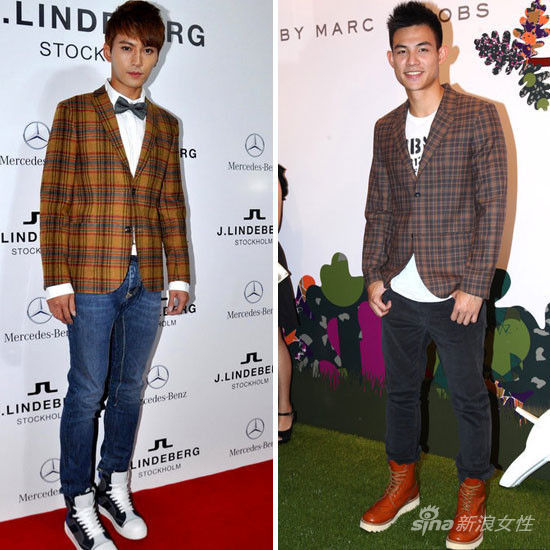 左图:2012年10月27日,北京,13春夏中国国际时装周J.Lindeberg专场。徐正曦亮色格纹西装搭配黑色领结、蓝色牛仔裤和黑色帆布鞋,休闲范儿十足。