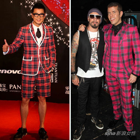 左图:2012年6月17日,上海,第15届上海国际电影节,2012星光上海华谊ELLE之夜举行。保剑锋格纹短打西装变身苏格兰型男 。黑框眼镜和黑色小领带起到点睛作用。