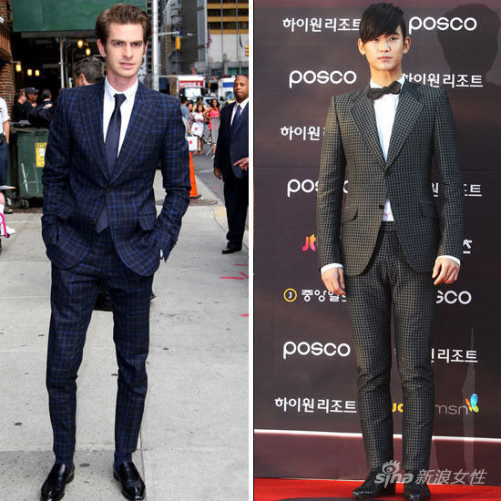 左图:安德鲁-加菲尔德格纹西装英气逼人,黑白经典搭配魅力四射。