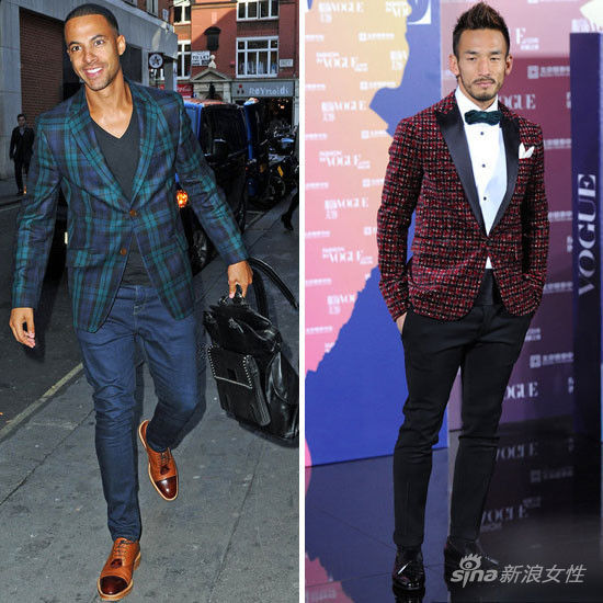 左图:2012年10月30日,北京,《Vogue》120周年庆典红毯。中田英寿酒红色的格纹西装彰显个性。