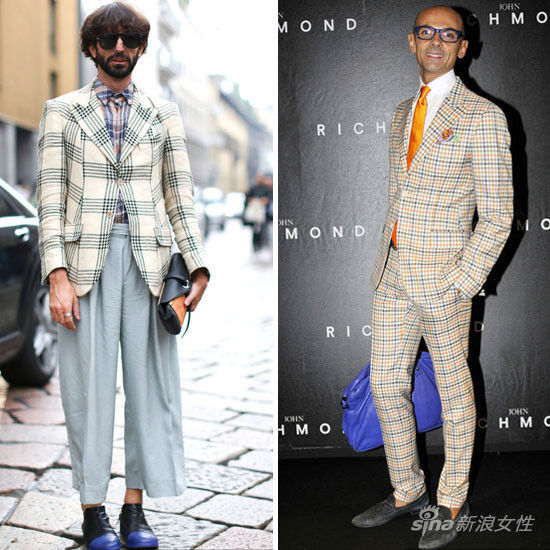 左图:米兰2013春夏时装周,街拍墨镜男身穿米色西装内搭条纹衬衫,夏装是阔腿裤和蓝色皮鞋,黑色和橘色拼接的手拿包也很有个性。