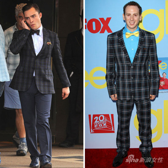 左图:艾德·维斯特维克(Ed Westwick)在《Gossip Girl》(绯闻女孩)中的剧照。格纹西装+黑色领结彰显少富气质,边走路边打电话更是不羁表现。