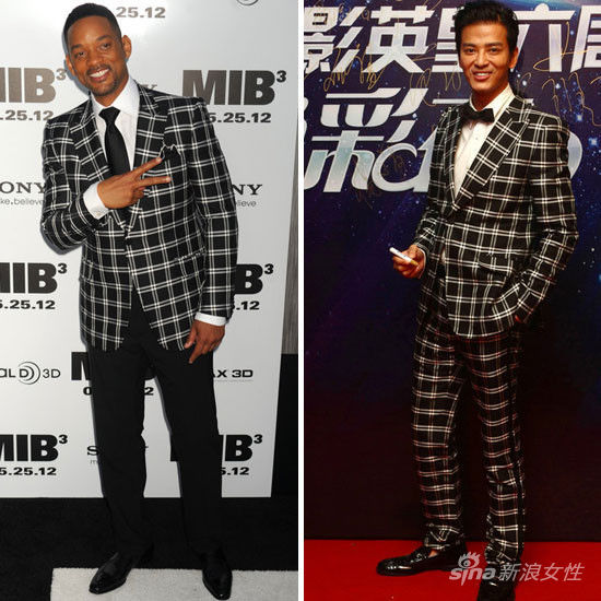 左图:威尔史密斯格纹西装搭配黑色领带,面对镜头,剪刀手扮酷。