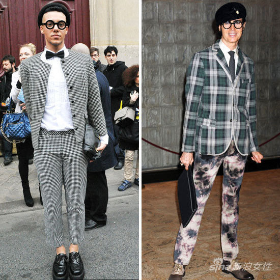 右图:纽约2013春夏时装周型男,藏青色的格纹西装外套和印花裤搭配,很花俏活泼,圆形的眼镜和手拿包增添了学院气息。