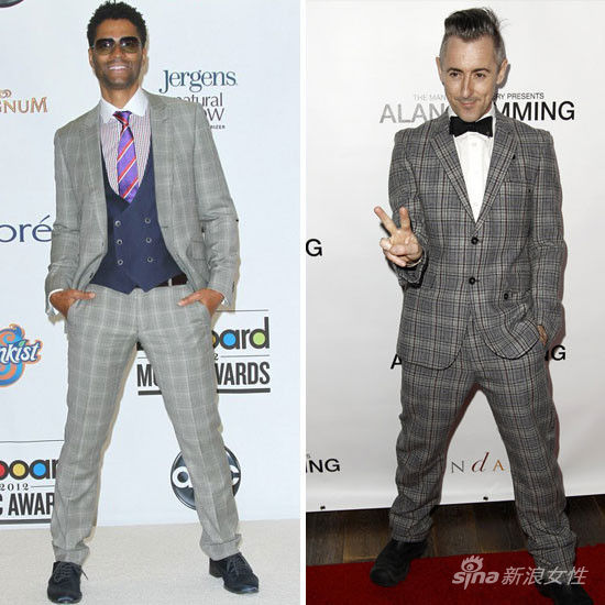 右图:曾在《X-战警2》等影片中出演角色的知名演员Alan Cumming灰白格纹西装休闲范儿十足,面对镜头做出V字造型。