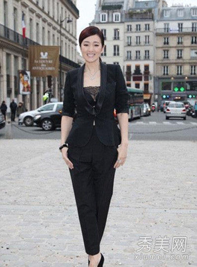 巩俐在正统的西服里,内搭黑色蕾丝边的单品,性感至极。