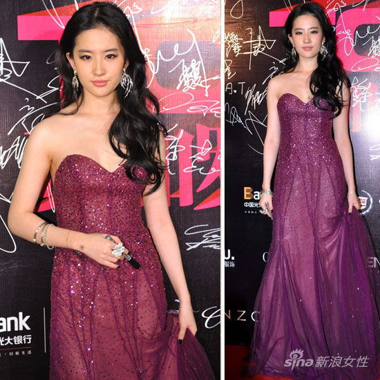 2012费加罗Top Life年度盛典,“神仙姐姐”刘亦菲一身紫色紧身低胸长裙亮相,微透的薄纱质地加上亮片衬托优雅轻盈的气质,搭配微卷的长发,美若天仙。