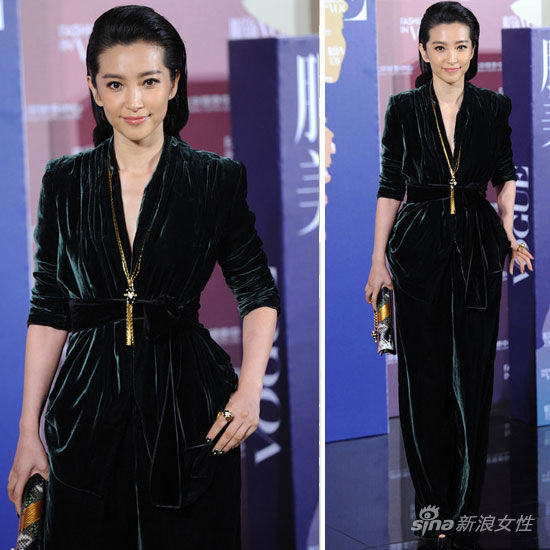 2012年10月30日,北京,《Vogue》120周年庆典红毯。李冰冰身穿Gucci[微博]墨绿色深V天鹅绒连体裤,搭配手拿包,中性帅气。
