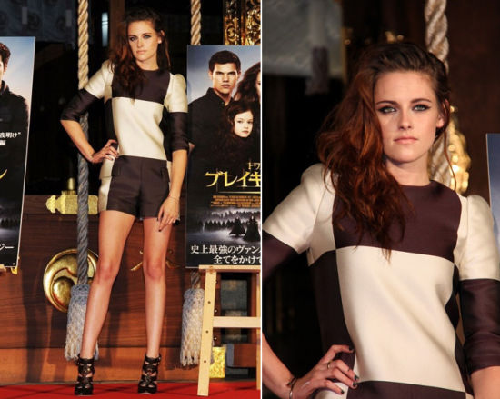 电影《暮光4:破晓(下)》日本首映式上,克里斯汀-斯图尔特穿着Louis Vuitton 2013春夏最新棋盘格的黑白套装,搭配一双性感利器的高跟鞋,大秀美腿!