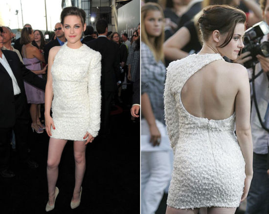 小K一袭纯白色镶钻单肩Elie Saab高级时装出席《暮光之城3:月蚀》LA首映。这条白色不对称设计的短裙下面秀美腿,上半身正面看起来不过就是少了一只袖子,背面才表露出设计师的心意,圆弧形的挖空设计正好呼应了新电影的名字:月蚀。