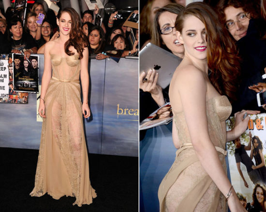 《暮光4:破晓(下)》洛杉矶首映,斯图尔特一袭低胸裙裸色美艳大面积半透明蕾丝裙亮相红毯。直接将这条Zuhair Murad透视裙穿上红毯似乎有一些限制级,恍惚间就看到其腰肋的肌肤与修长美腿,带有侵略性的美艳让人无法直视。
