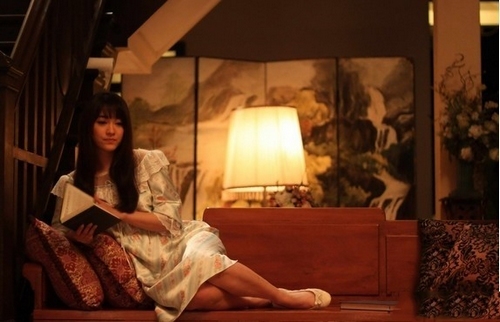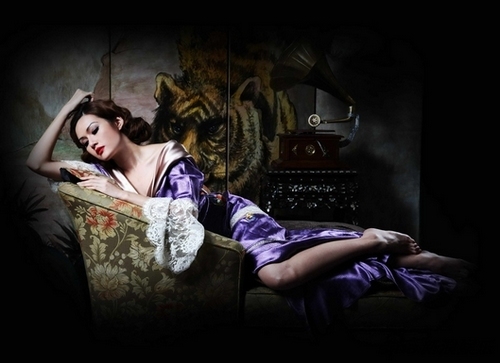 紫色丝绸睡衣展现了女主角成熟优雅性感的魅力,蕾丝袖摆的装饰让人心动。