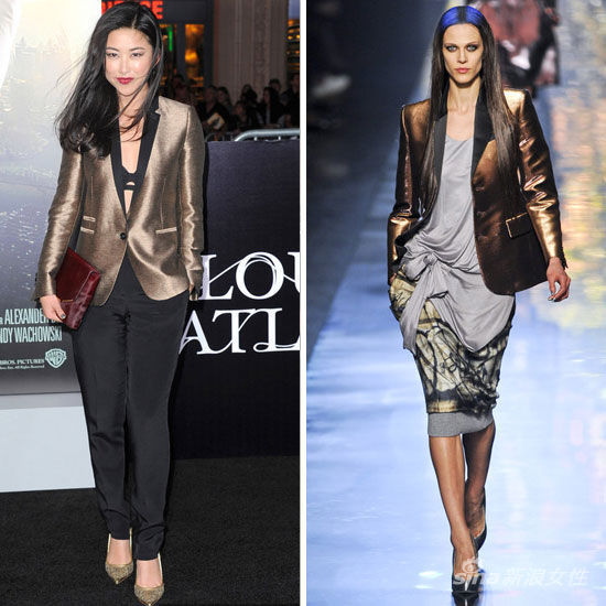 当地时间2012年10月24日,美国好莱坞,影片《云图》好莱坞首映礼举行。朱珠一袭金色西装搭配黑裤造型,黑色Bra若隐若现帅气又性感。这款西服来自Jean Paul Gaultier 2012 秋冬系列。