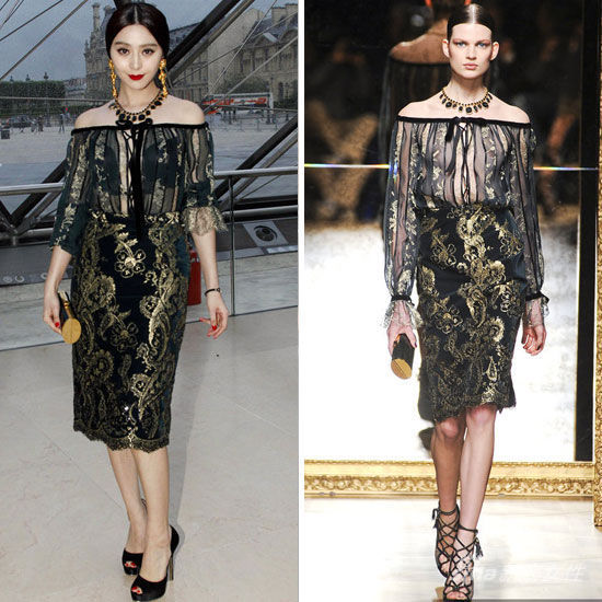当地时间2012年6月12日,法国巴黎,Salvatore Ferragamo 2013早春度假系列卢浮宫上演。范冰冰穿着由品牌创意总监Massimiliano Giornetti设计的2012秋冬系列金色刺绣蕾丝缎带交互编织深蓝色露肩礼服,配同色系金色刺绣天鹅绒长裙,贵气十足!