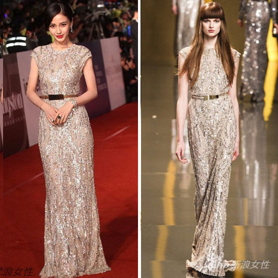 angelababy[微博]身着Elie Saab2012秋冬系列银色连身长裙亮相红毯。温婉的黑色发髻和银色礼服裙衬托出脱俗的古典美,走动中柔美飘逸的闪亮裙摆让baby的好身材展露无遗。