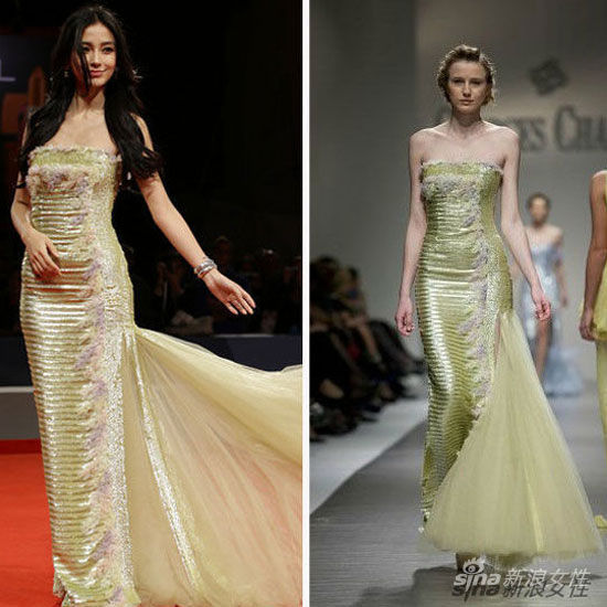 意大利威尼斯电影节《太极》首映式,Angelababy(杨颖)穿着Georges Chakra 2012春夏高级定制系列的黄绿色抹胸长裙出场,甜美又不失性感,低调又不失气场,把大牌裙装拿捏得恰到好处。