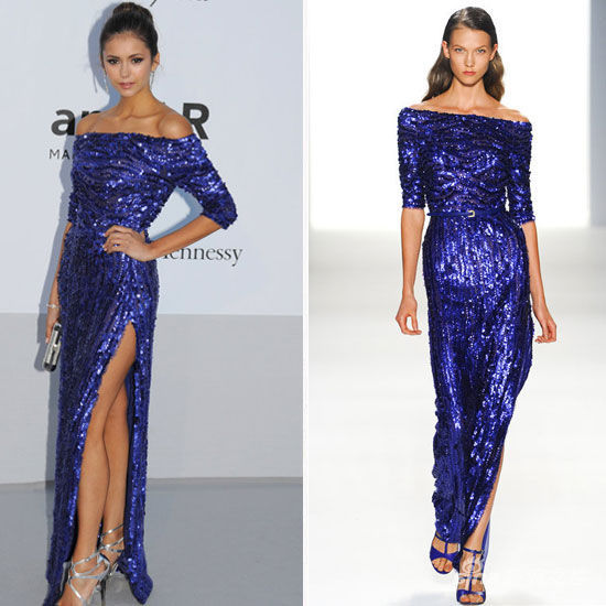 Nina Dobrev(妮娜·杜波夫)身穿蓝色ELIE SAAB2012春夏款礼服。一字领高开叉礼裙,大秀性感香肩和美腿。