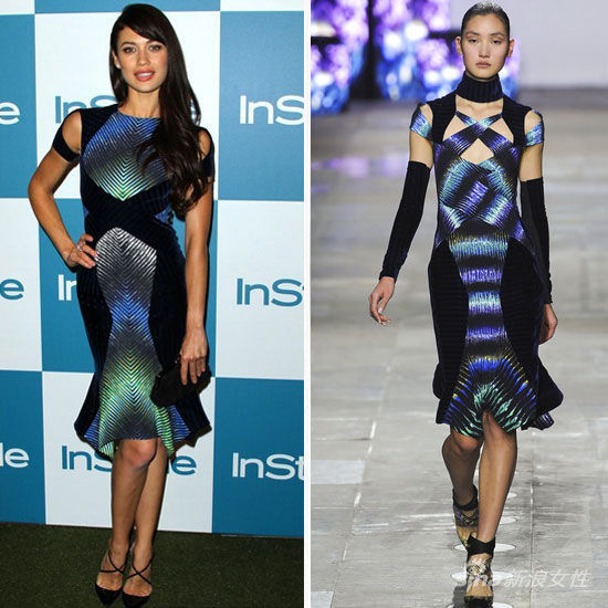 乌克兰的名模Olga Kurylenko身穿Peter Pilotto 2012秋冬拼接印染礼服,大秀S凹凸身材。