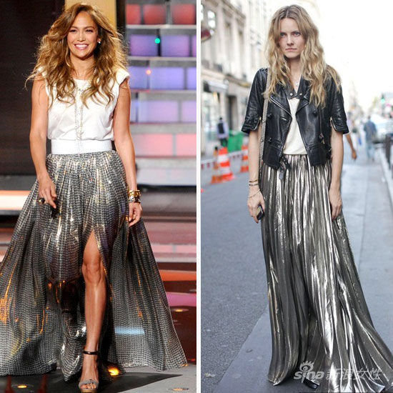 詹妮弗-洛佩兹唱而优则评!华丽变身《美国偶像》评审已进入第2个年头,詹妮弗评得好不好先不说,穿得则是满眼大牌!Gucci[微博]、Lanvin、Dolce&Gabbana等高级时装一路演绎,这一身是来自Lanvin 2012 度假系列的连衣裙。白色 tee 搭配银灰色高开衩金属亮片长裙以及宽手镯,十分拉风!