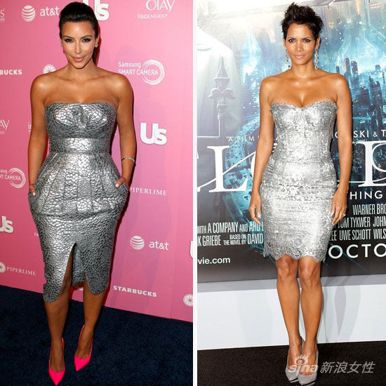 《US Weekly》杂志热力好莱坞派对,金-卡戴珊亚光面裹胸闪片连衣裙硬朗帅气,桃红色尖头高跟鞋是亮点。黑美人哈莉·贝瑞 (Halle Berry)银色Dolce & Gabbana裹胸连衣裙性感婀娜。