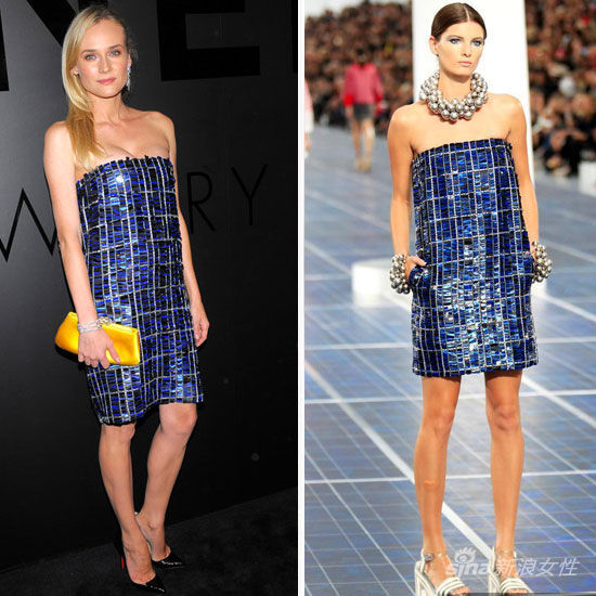 黛安-克鲁格(Diane Kruger)身穿Chanel2013款蓝色裸肩亮片晚装,搭配明黄色的手拿包,蓝黄撞色,很是俏皮,和模特不同,她取掉了烦琐了项链首饰,反倒给人清新干净的感觉。