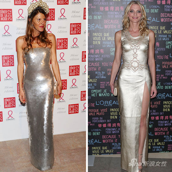 安娜·戴洛·罗素(Anna Dello Russo)银色裹胸礼服搭配面纱、头饰时尚大气。当地时间2012年5月19日,美国,第65届戛纳电影节欧莱雅[微博]时尚派对。名模莎拉-马歇尔亚光面淡金色高开叉长裙,双峰高耸,美腿诱人。