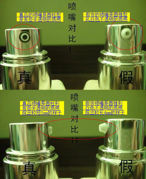 第二看瓶口,压嘴设计有时是一个品牌的专利,所以通过观察压嘴是一个好方法。正品压嘴做工细致且小巧,假货压嘴笨重且大。