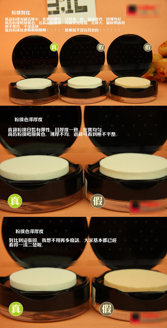 粉扑,正品粉扑海绵孔娇小,密实有弹性,且厚度一致,边缘整齐,弹性好。仿品的粉扑略显黄色,质地粗糙,切面不齐。更有甚者粉扑颜色彻底为黄色,肉眼十分好辨认。