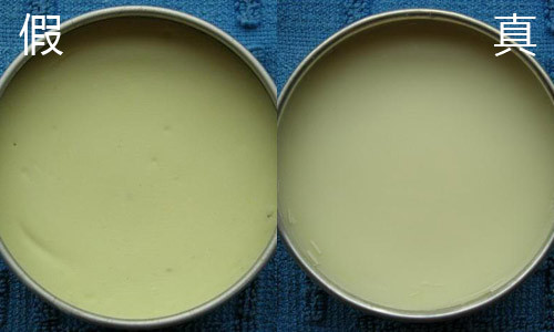 膏体,颜色比较接近,正品稍白些,仿品膏体偏黄些。但质地差别很大,正品质地细腻略带透明质感,表面光滑无杂质。仿品里面有杂质,有小气孔,很干涩,无光滑细腻以及透明质感。