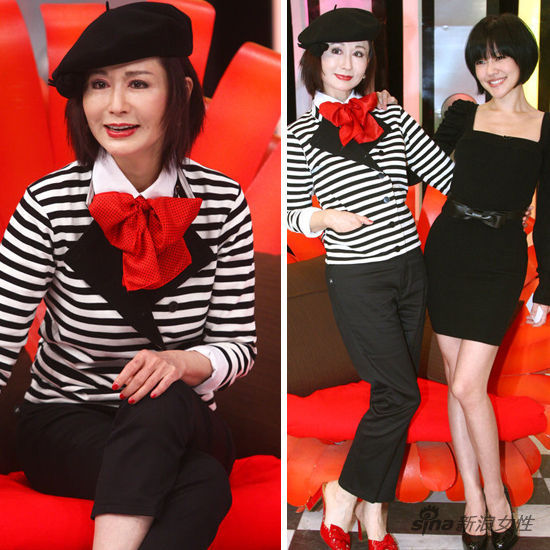 《康熙来了》录影,潘迎紫和小S合影犹如两姐妹,贝雷帽搭配黑白条纹上衣,黑色蝴蝶结减龄又可爱。